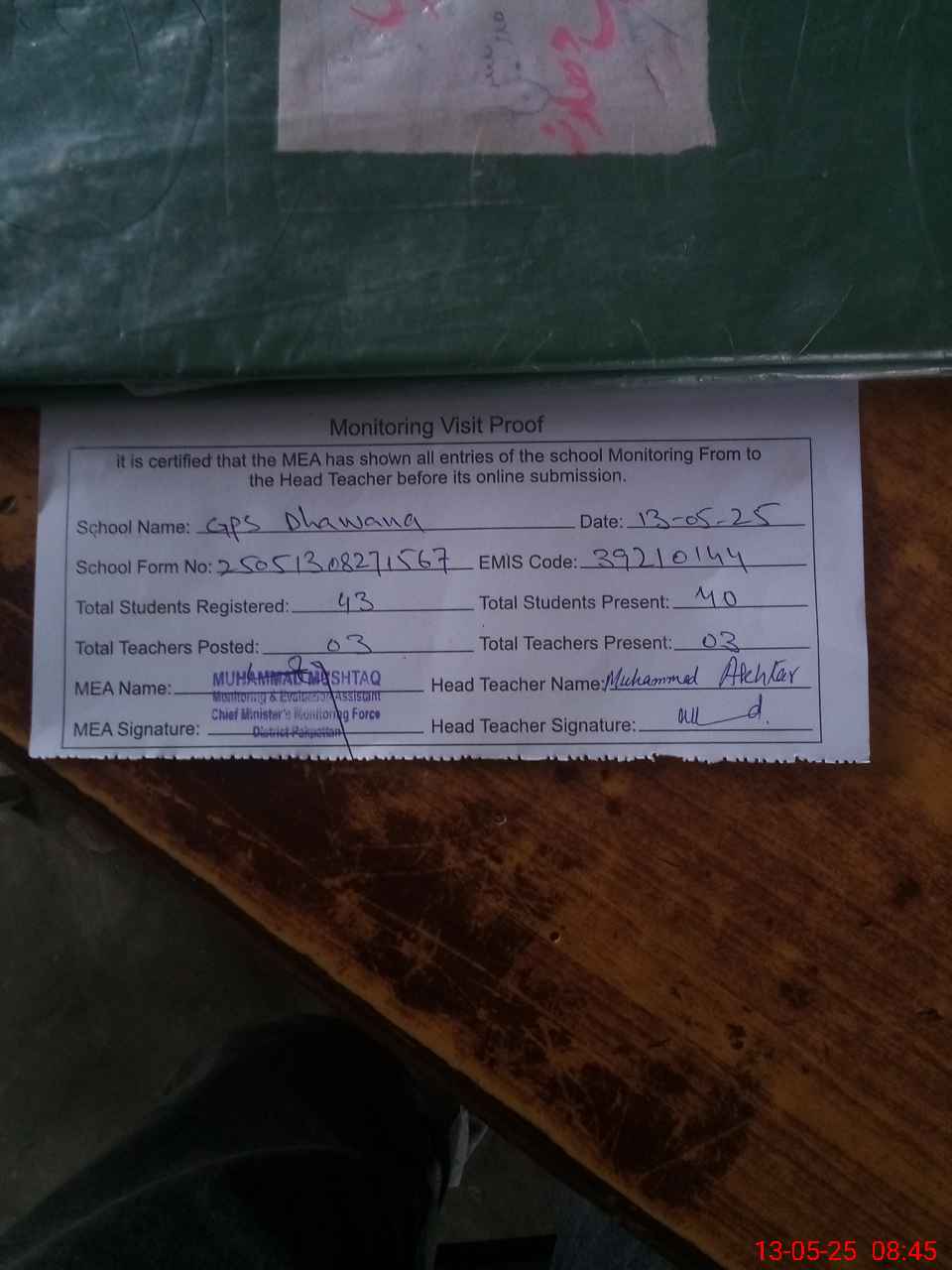 | Attendance Register | Head Teacher | MEA with School | Visit Proof |