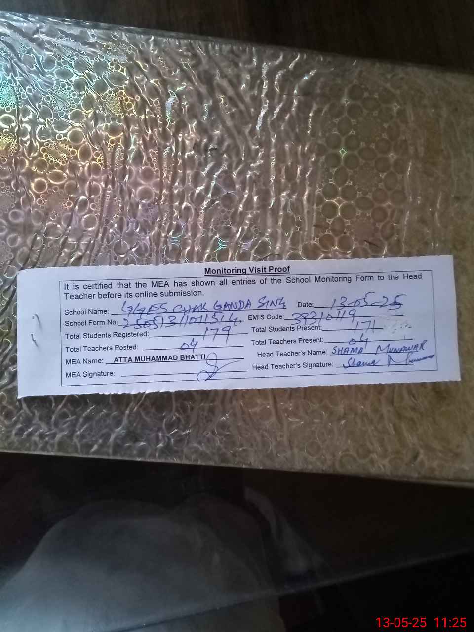 | Attendance Register | Head Teacher | MEA with School | Visit Proof |