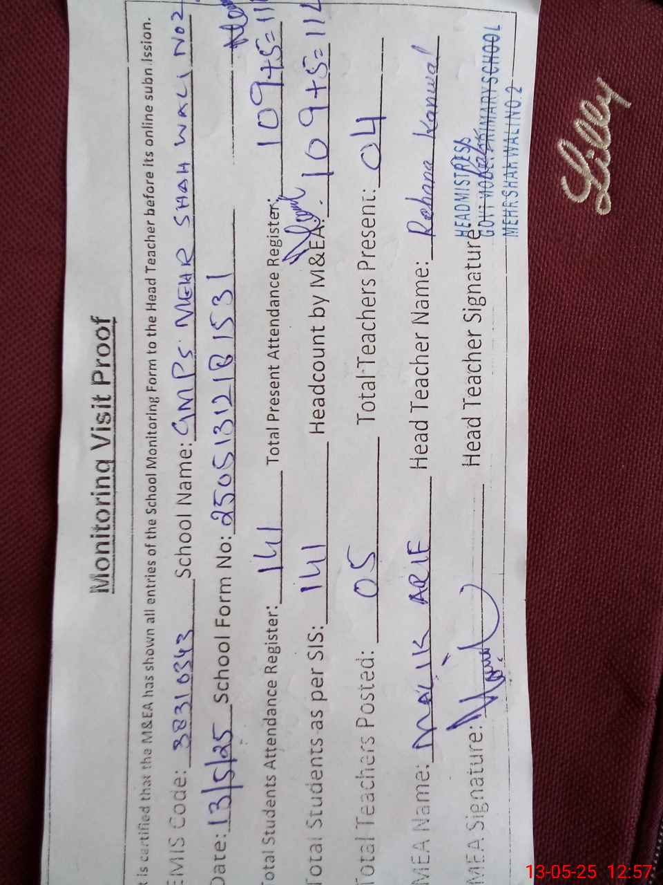 | Attendance Register | Head Teacher | MEA with School | Visit Proof |