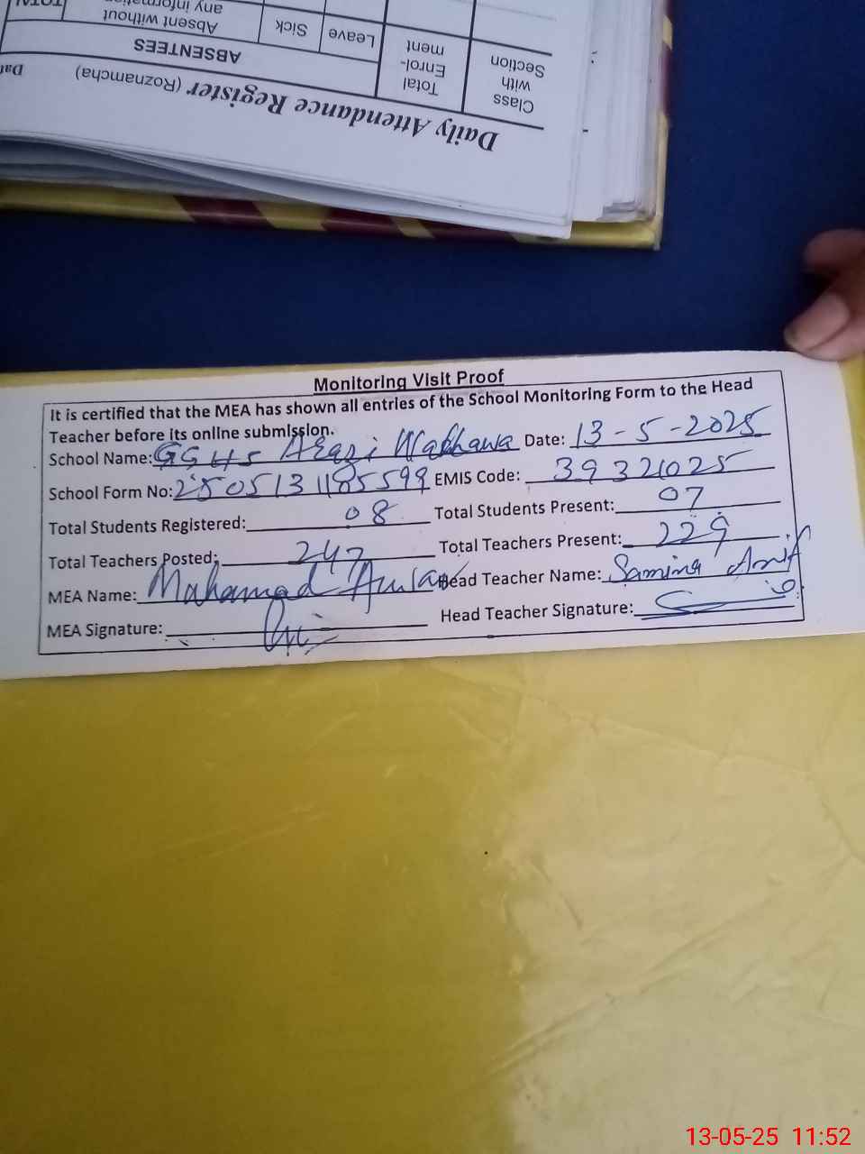| Attendance Register | Head Teacher | MEA with School | Visit Proof |