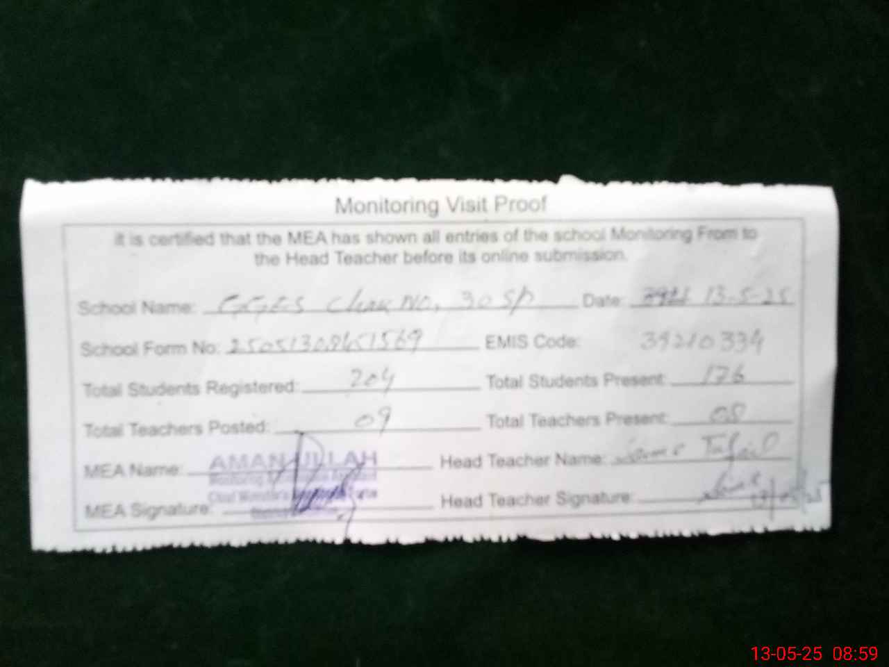 | Attendance Register | Head Teacher | MEA with School | Visit Proof |