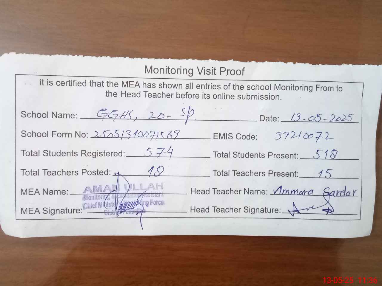 | Attendance Register | Head Teacher | MEA with School | Visit Proof |
