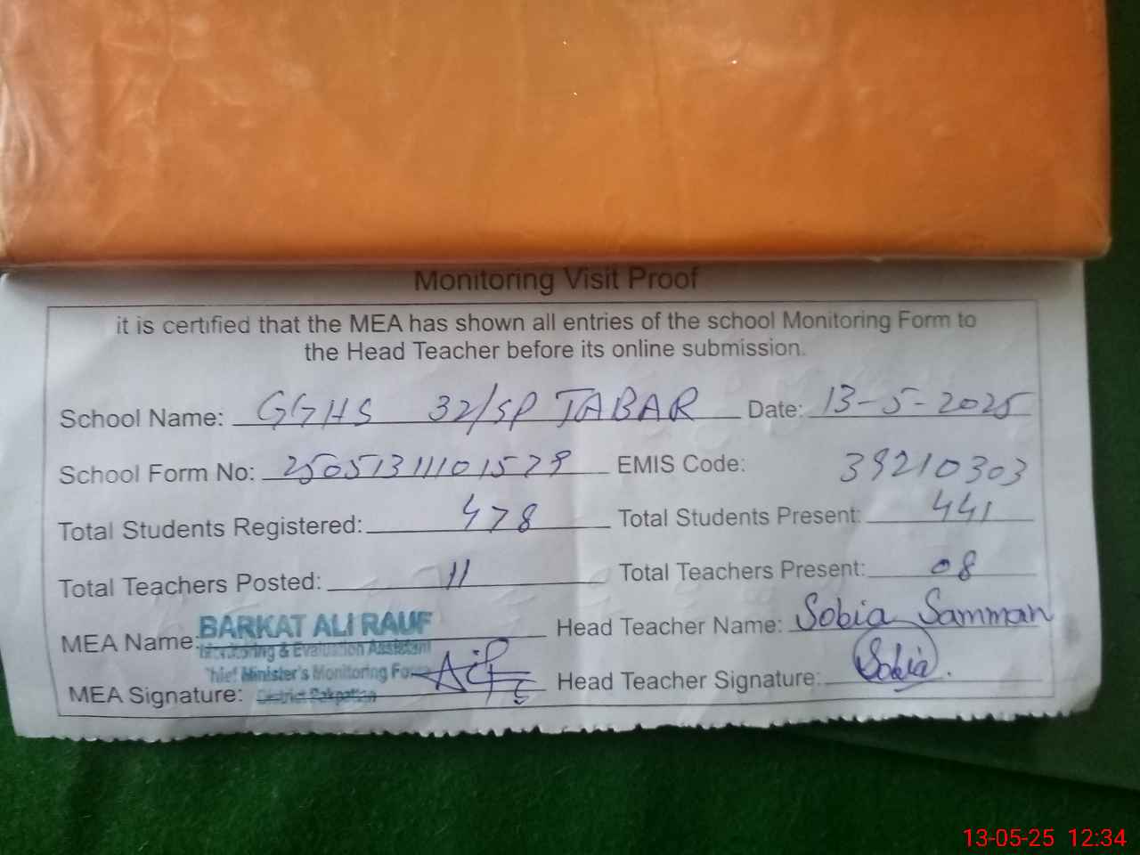 | EMIS Code: 39210303 | Name of School: GGHS CHAK NO.32 SP TABAR | |||