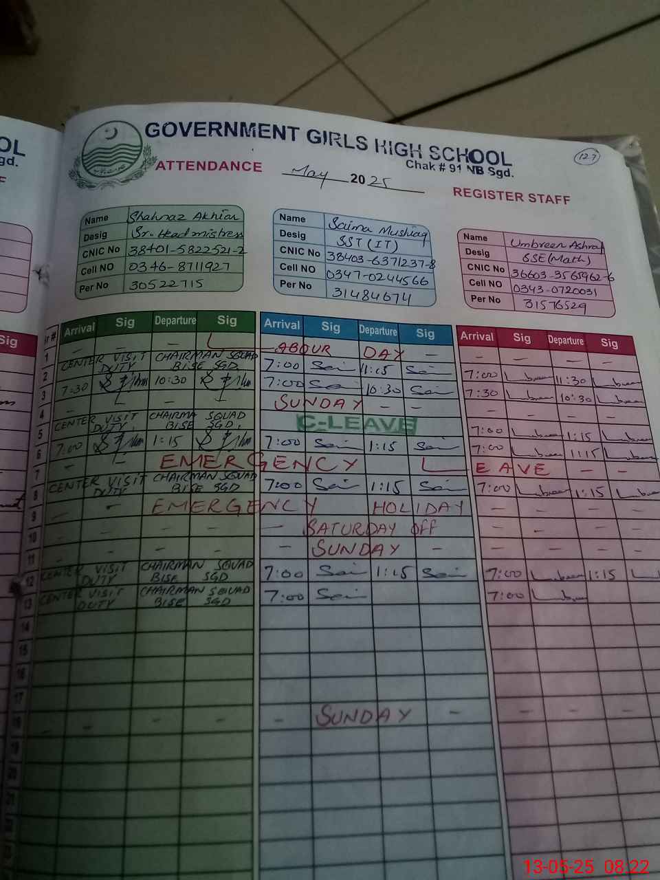 | CNIC | Full Name | Designation | R/C | Absence during last cal. month |