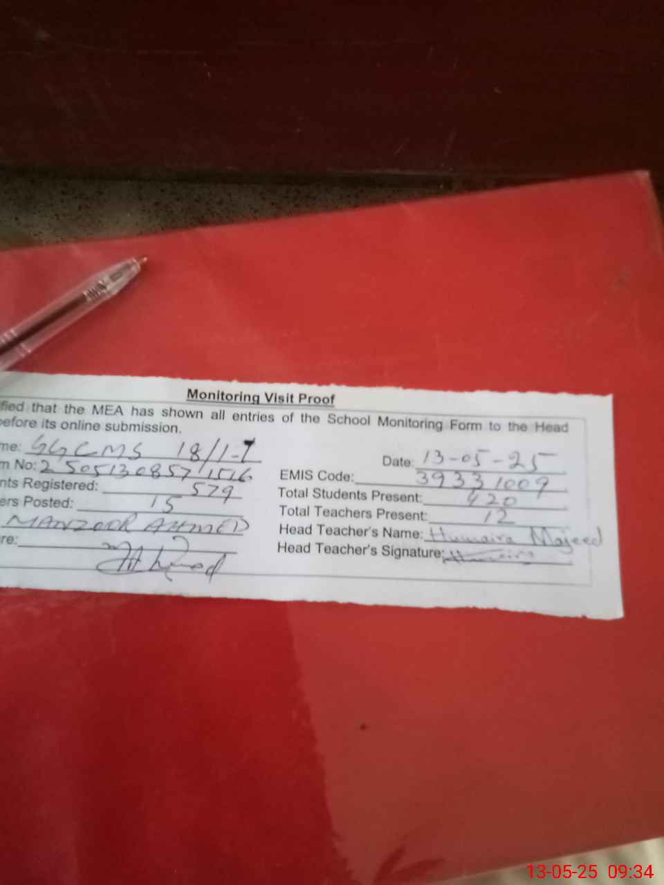 | Attendance Register | Head Teacher | MEA with School | Visit Proof |