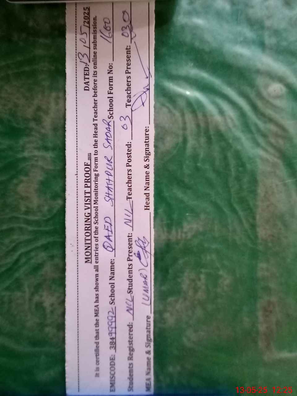 | Certified that this School was Inspected by the Undersigned MEA/DMO Today and the Information Stated Above is as Per Record. | |||||