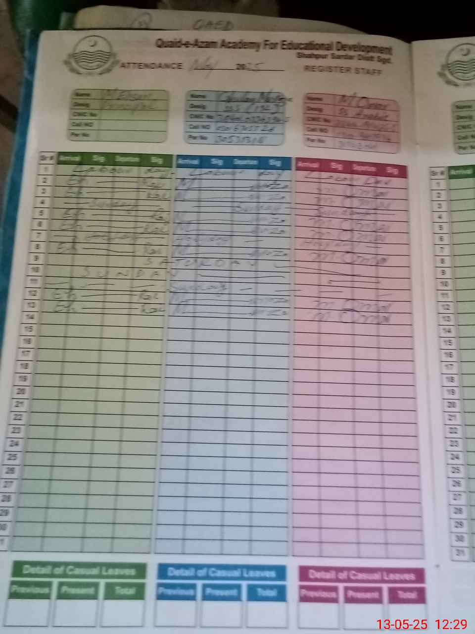 | CNIC | Full Name | Designation | R/C | Absence during last cal. month |