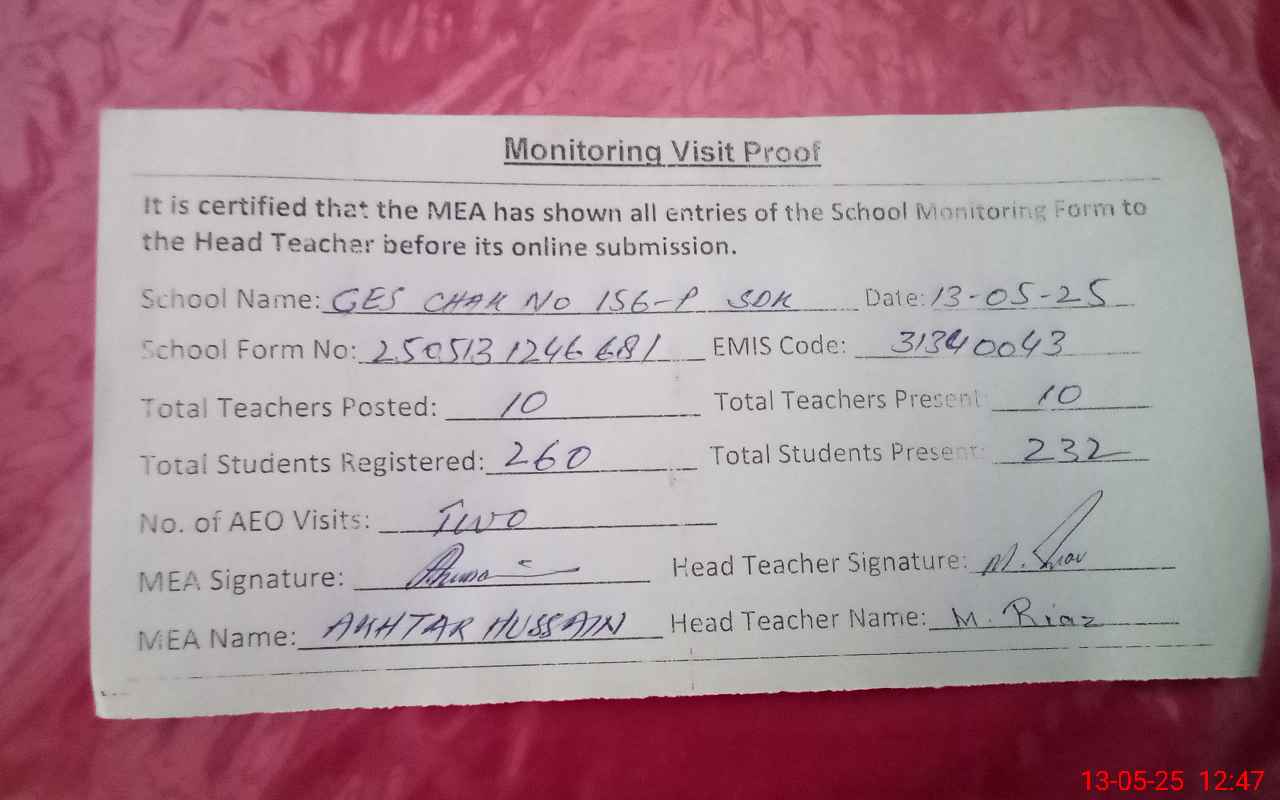 | Attendance Register | Head Teacher | MEA with School | Visit Proof |