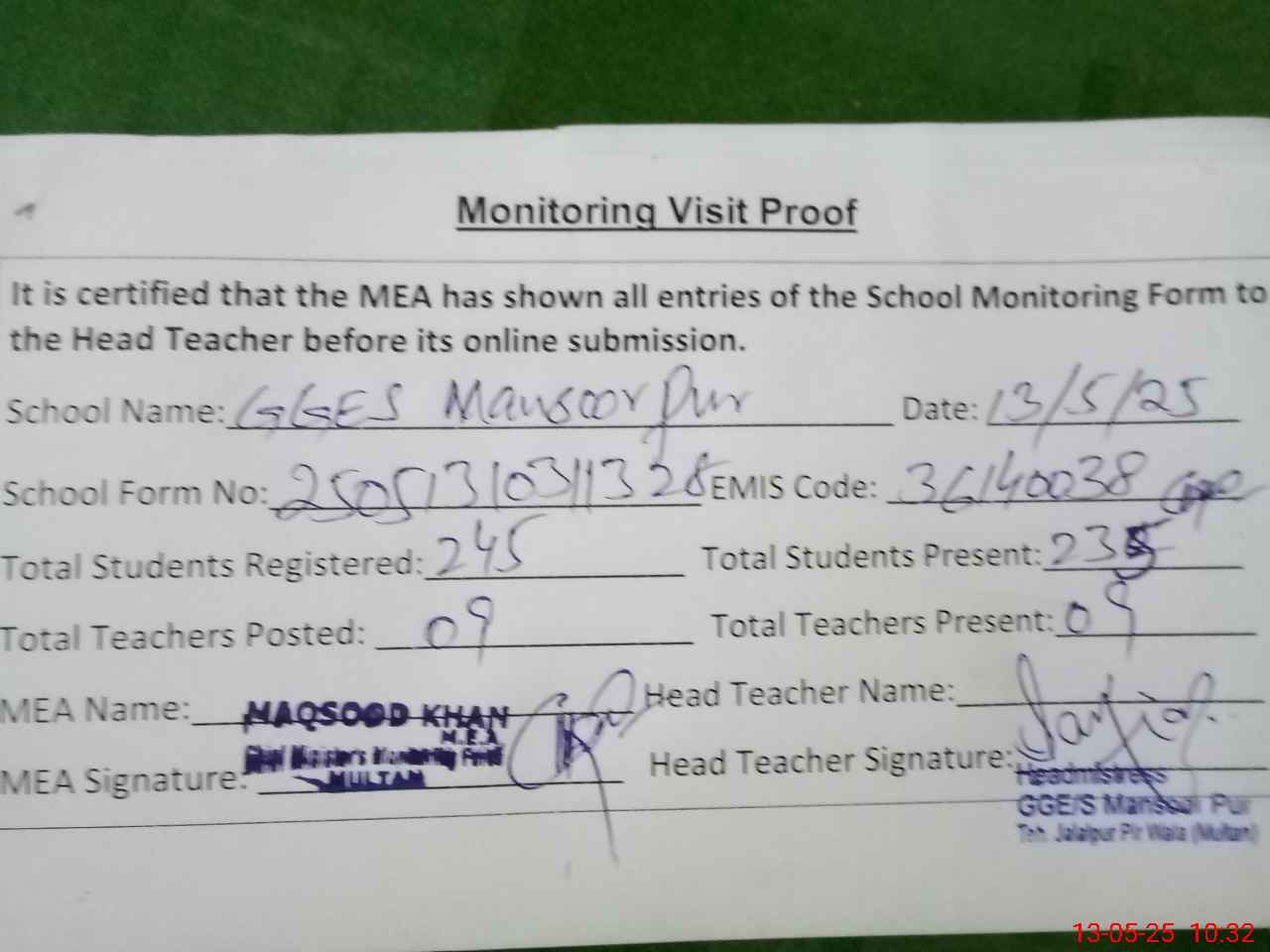 | Certified that this School was Inspected by the Undersigned MEA/DMO Today and the Information Stated Above is as Per Record. | |||||