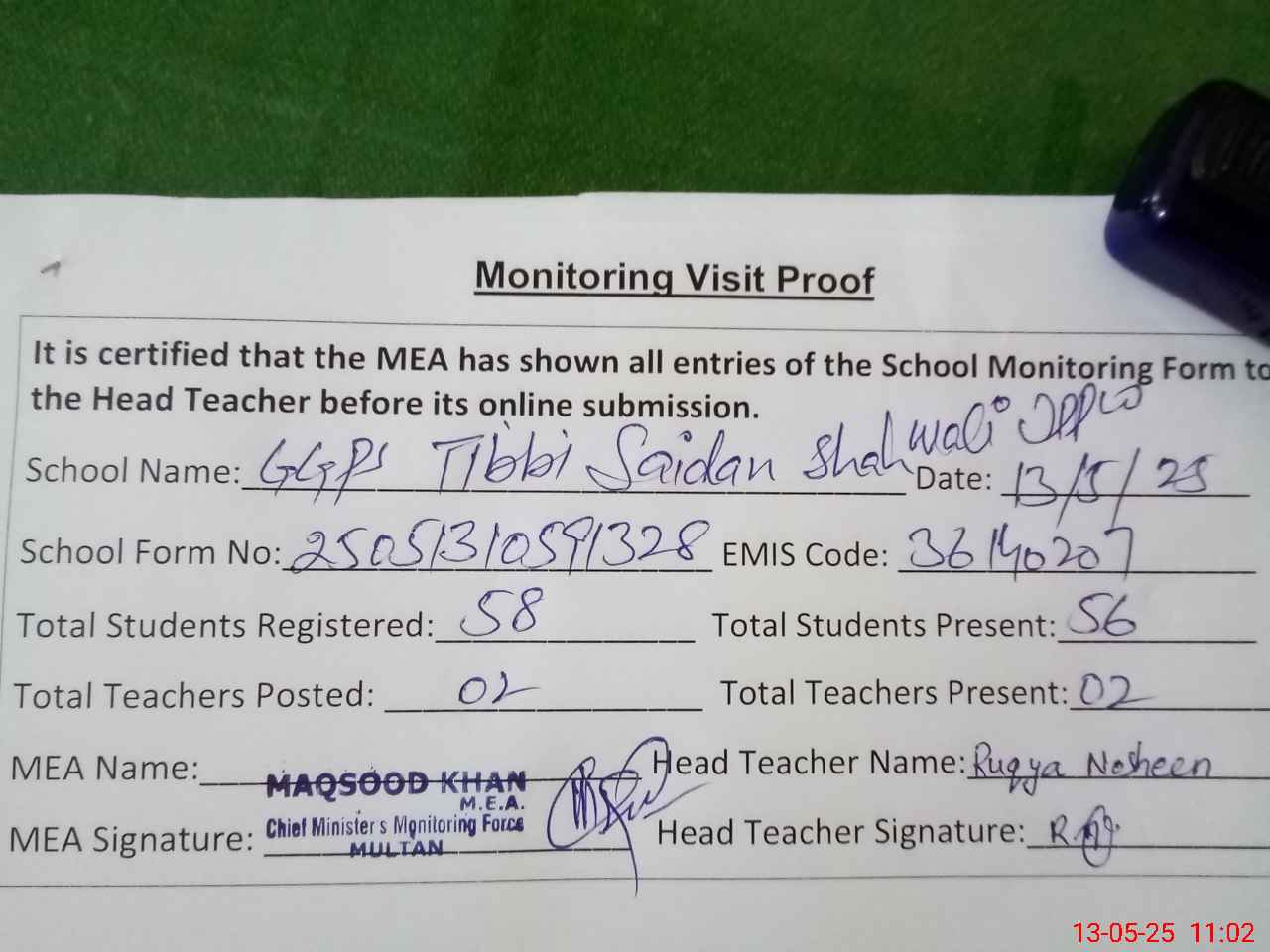 | Attendance Register | Head Teacher | MEA with School | Visit Proof |