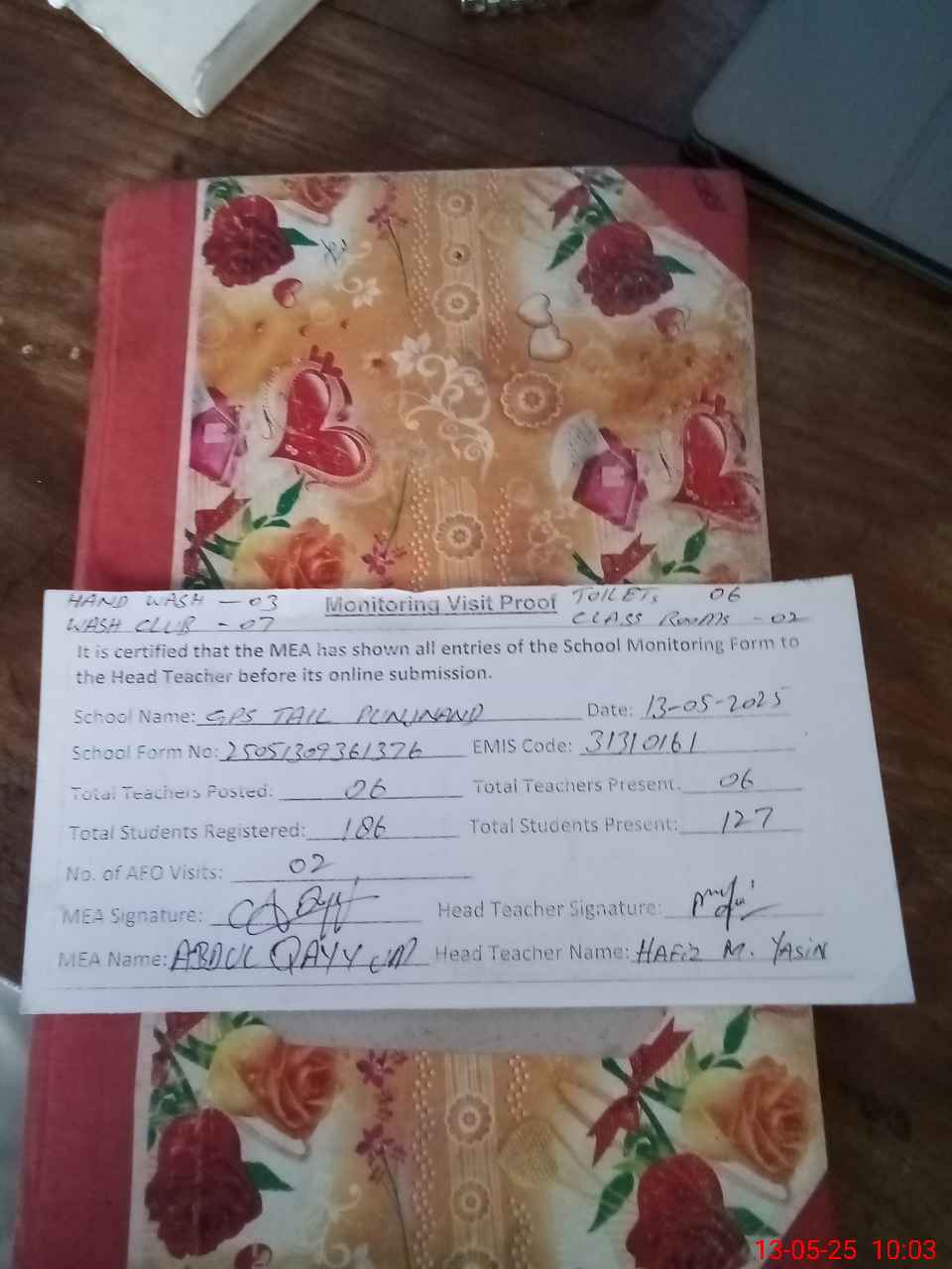 | Attendance Register | Head Teacher | MEA with School | Visit Proof |