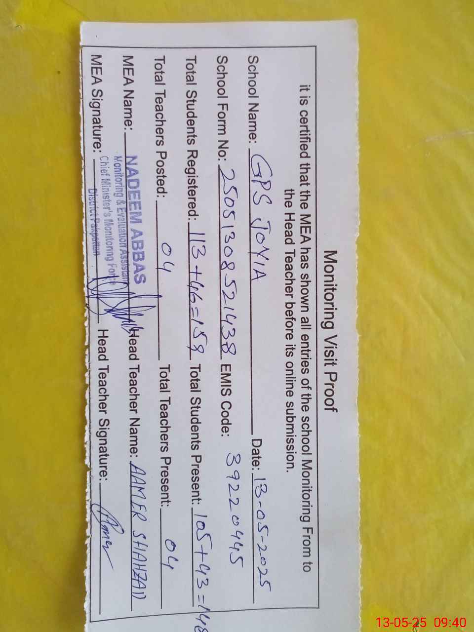 | EMIS Code: 39220445 | Name of School: GPS JOYIA P.O NOORA PATH ARIF WALA | |||