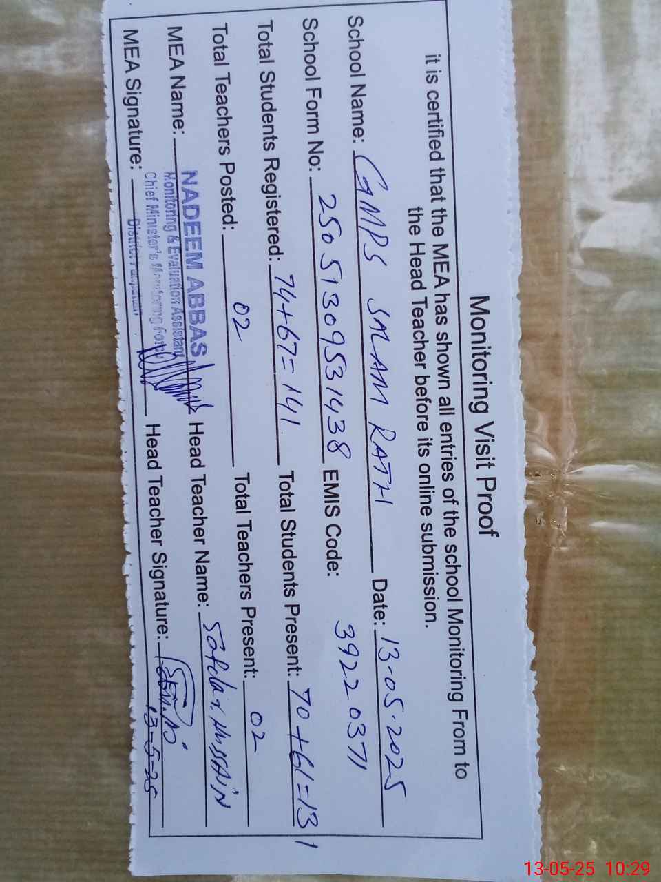 | EMIS Code: 39220371 | Name of School: GMPS SALAM RATH | |||