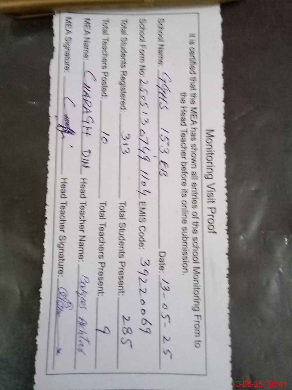 | Attendance Register | Head Teacher | MEA with School | Visit Proof |