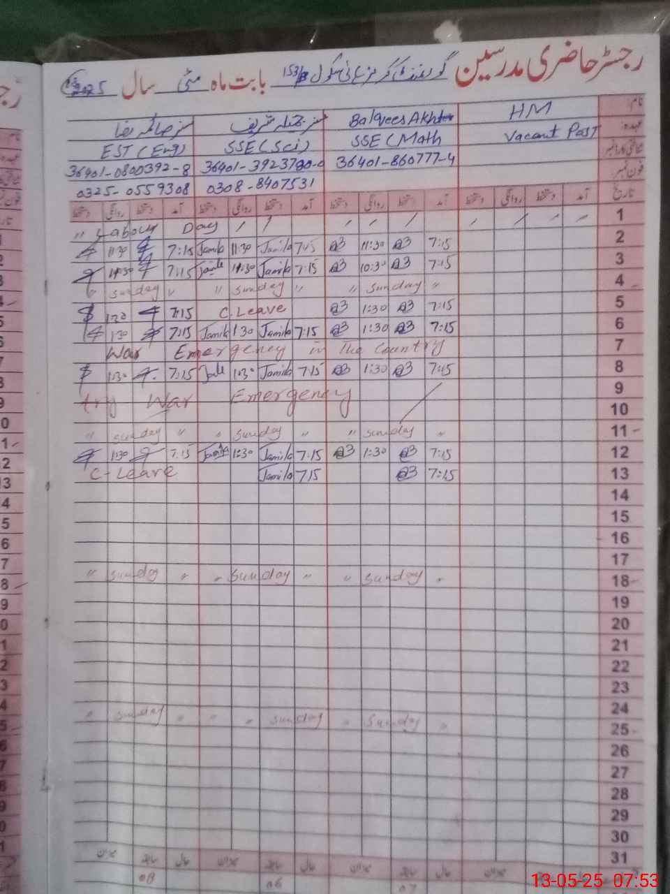 | CNIC | Full Name | Designation | R/C | Absence During Last Calender Month |