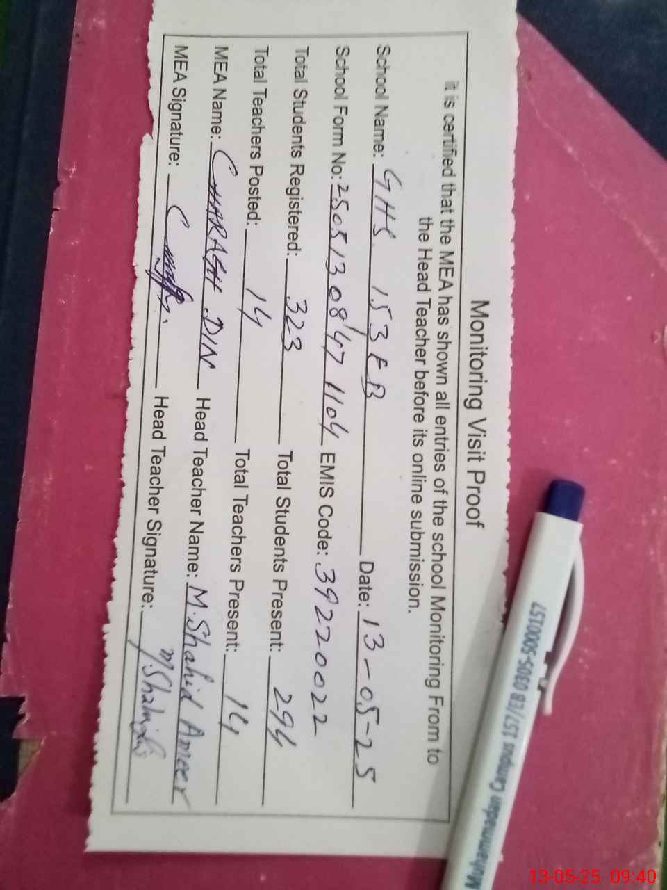 | Attendance Register | Head Teacher | MEA with School | Visit Proof |