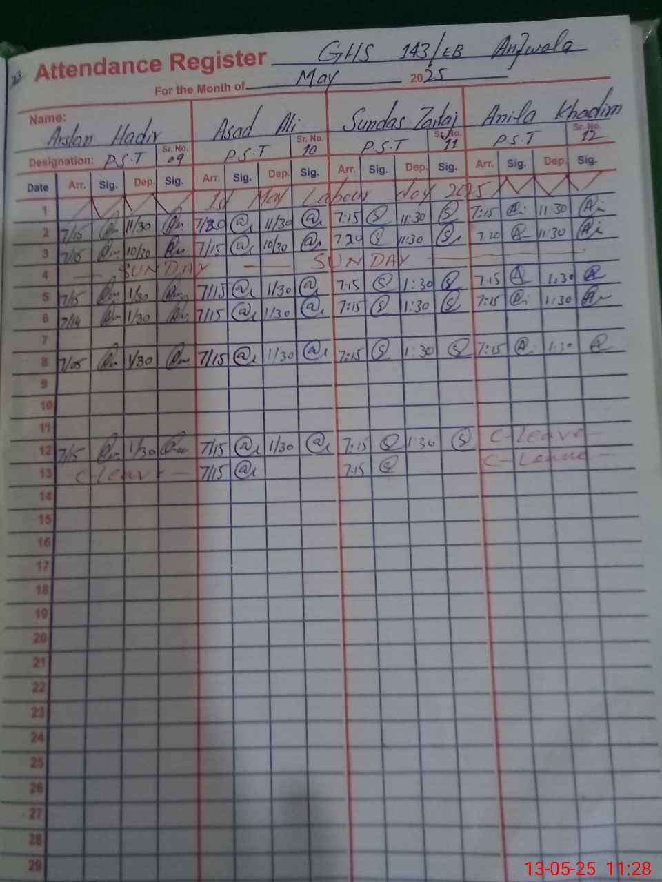 | CNIC | Full Name | Designation | R/C | Absence During Last Calender Month |