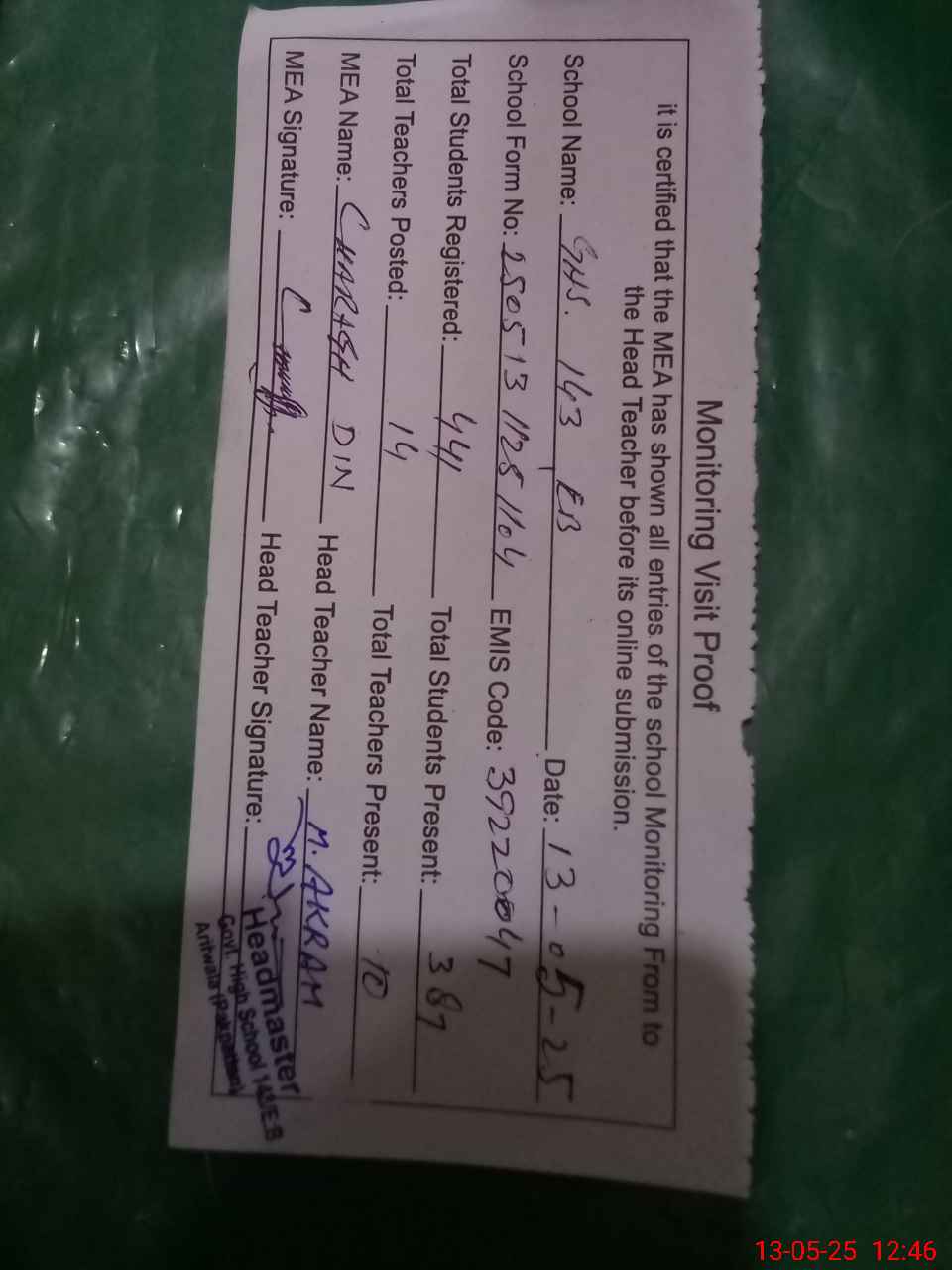 | Attendance Register | Head Teacher | MEA with School | Visit Proof |
