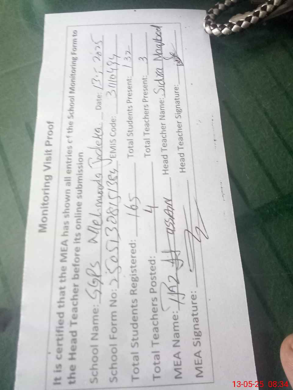 | Attendance Register | Head Teacher | MEA with School | Visit Proof |