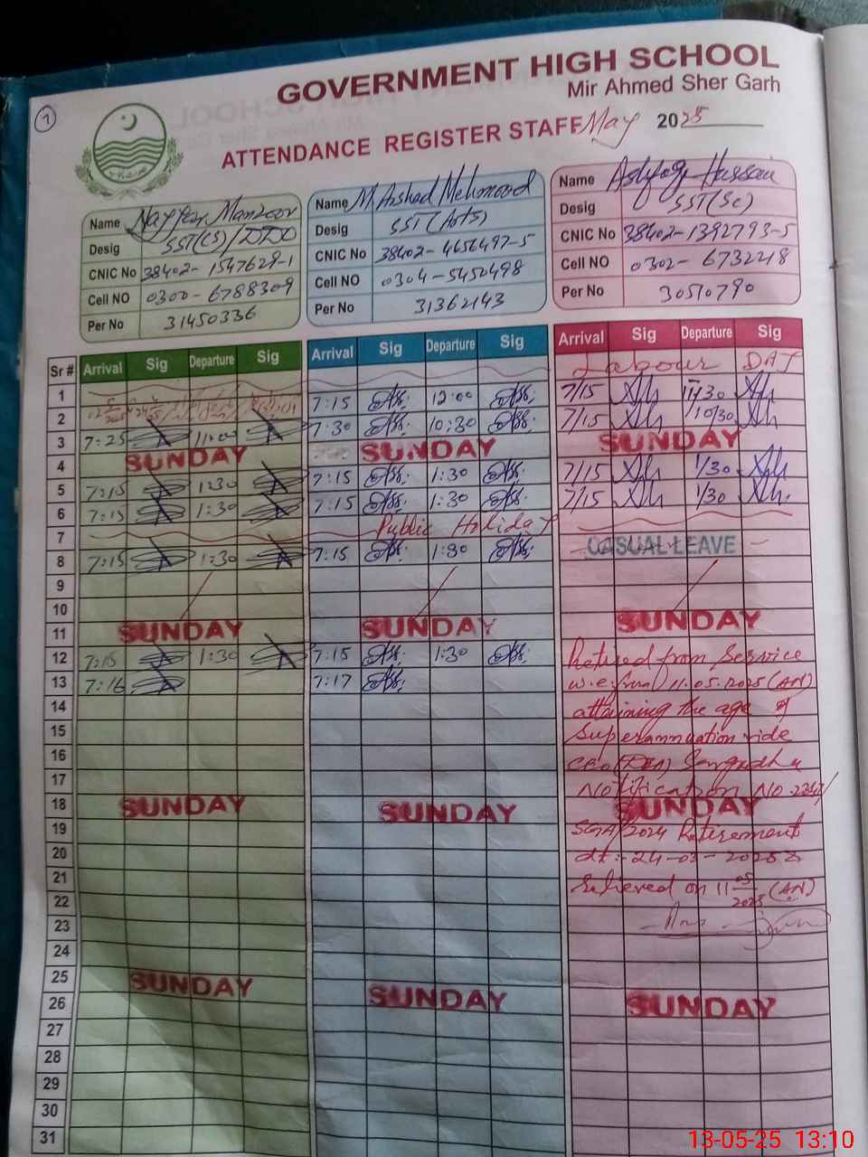| CNIC | Full Name | Designation | R/C | Absence during last cal. month |