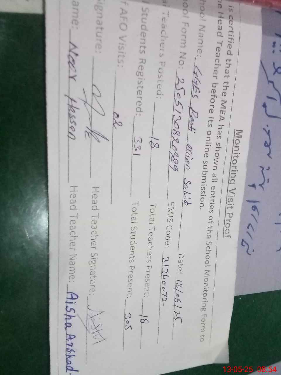 | Name: Ay**** Ar**** Designation: (School Headmaster's/Headmistress's) SST Phone/Cell Number: 03**** |