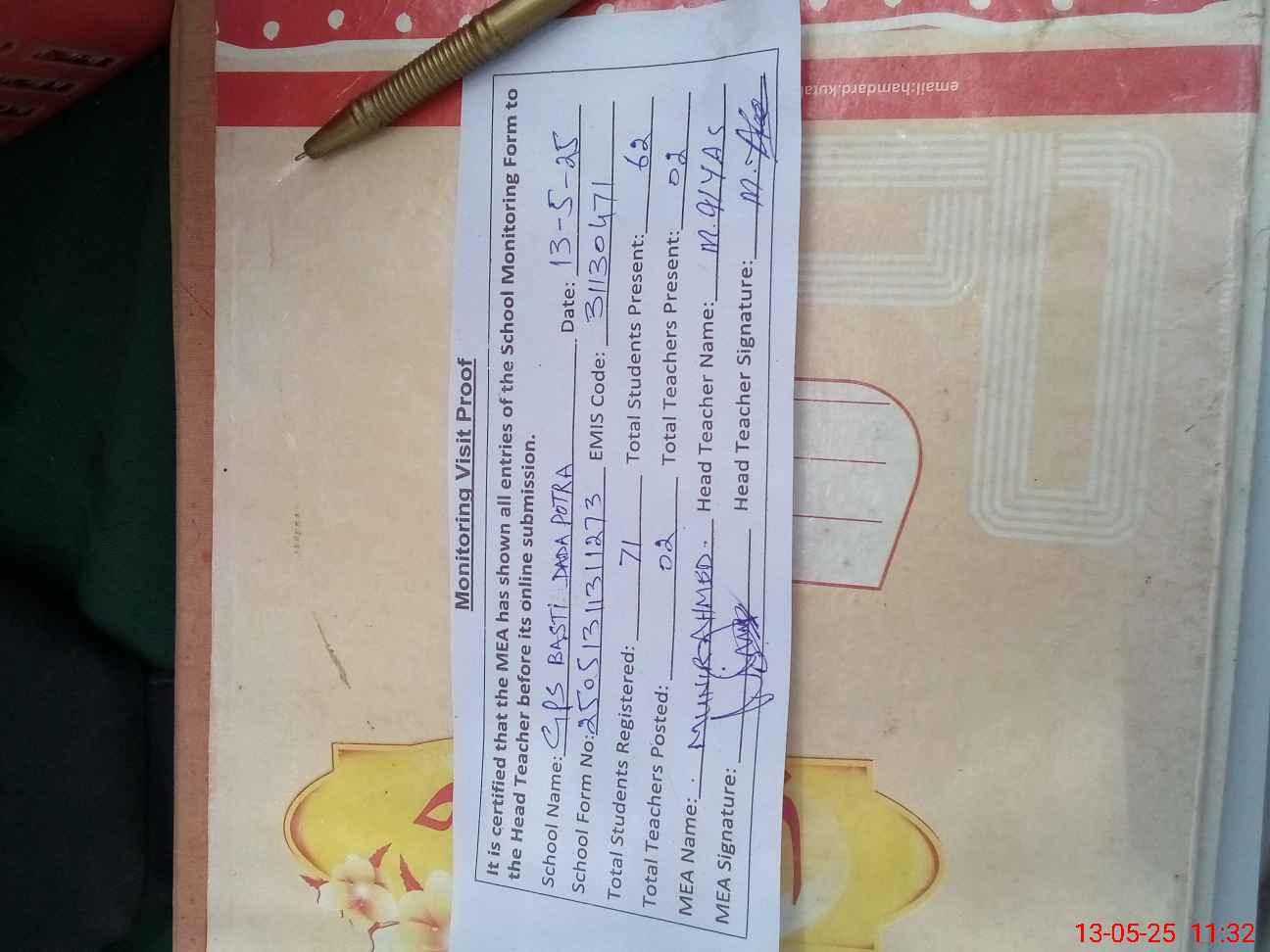 | Attendance Register | Head Teacher | MEA with School | Visit Proof |