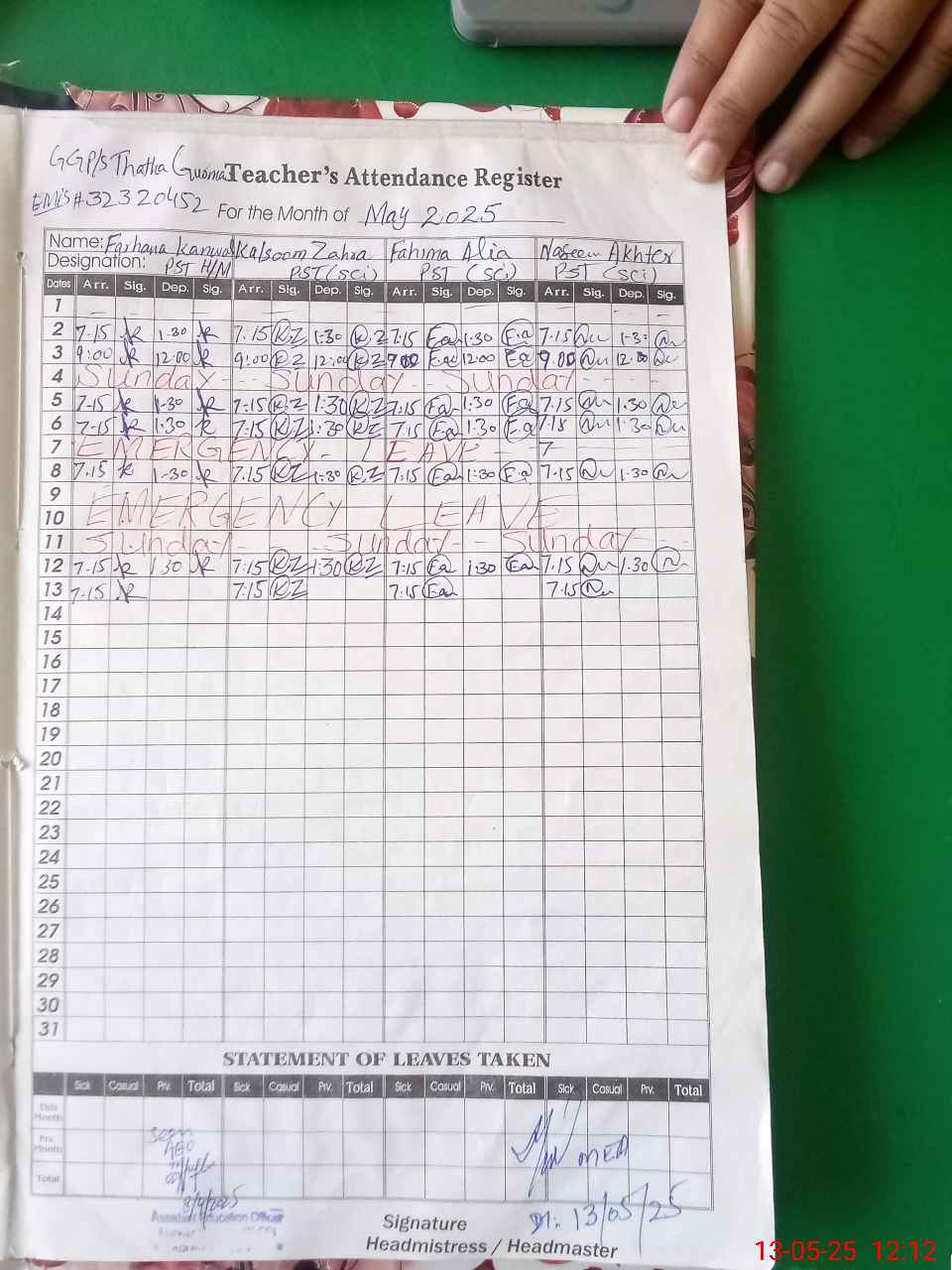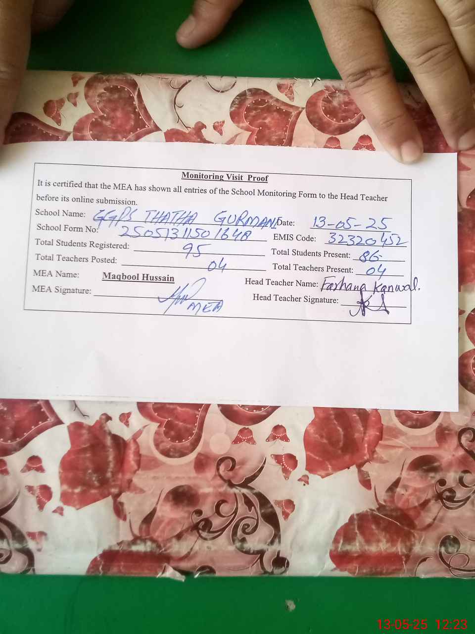 | Attendance Register | Head Teacher | MEA with School | Visit Proof |