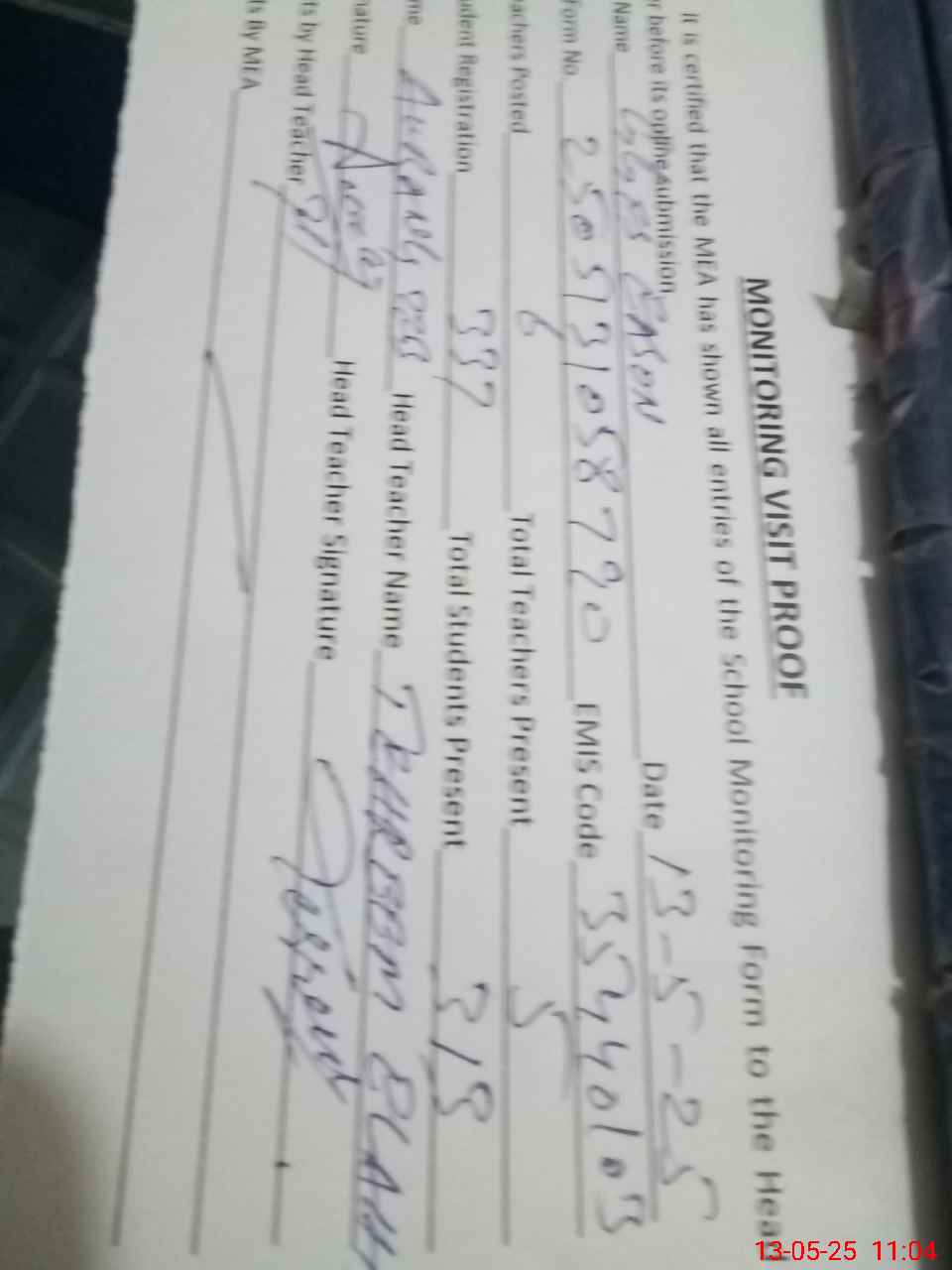 | Attendance Register | Head Teacher | MEA with School | Visit Proof |