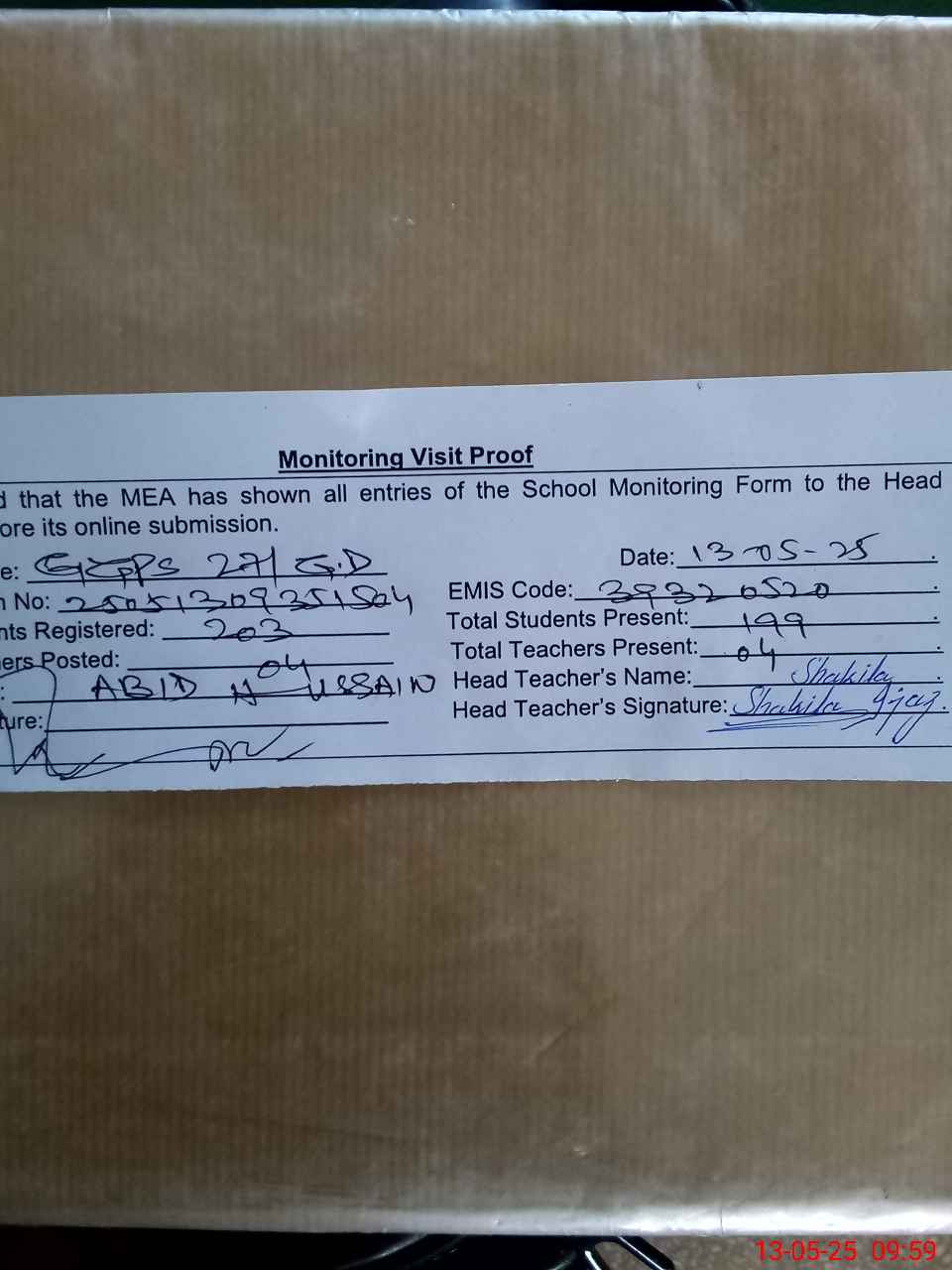 | Attendance Register | Head Teacher | MEA with School | Visit Proof |