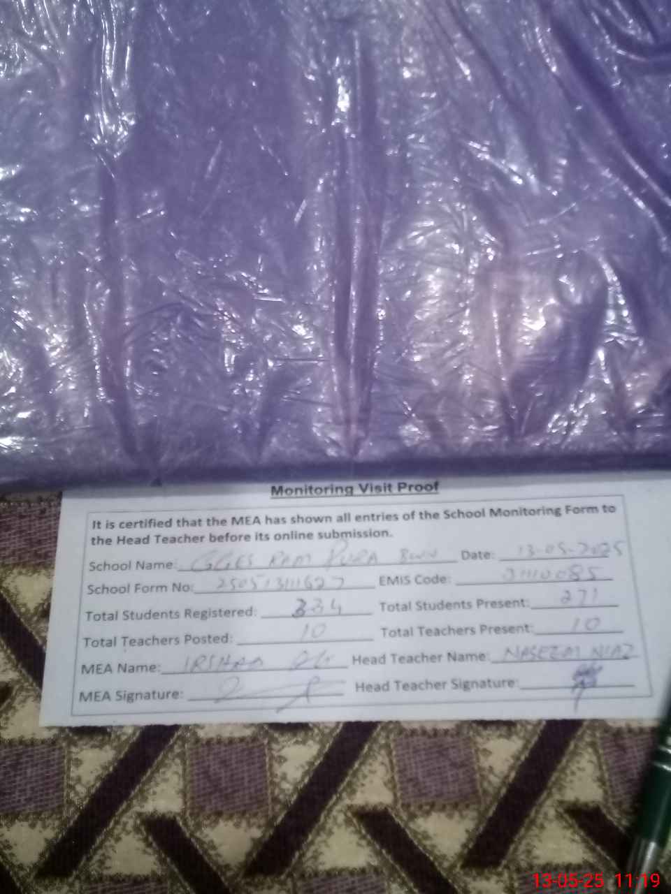 | Attendance Register | Head Teacher | MEA with School | Visit Proof |
