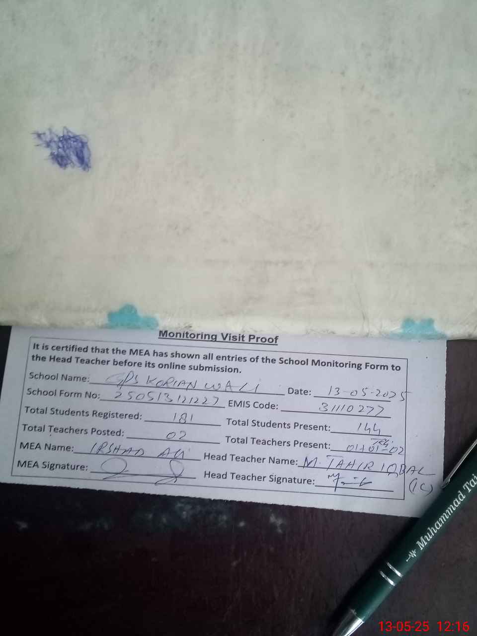 | Attendance Register | Head Teacher | MEA with School | Visit Proof |