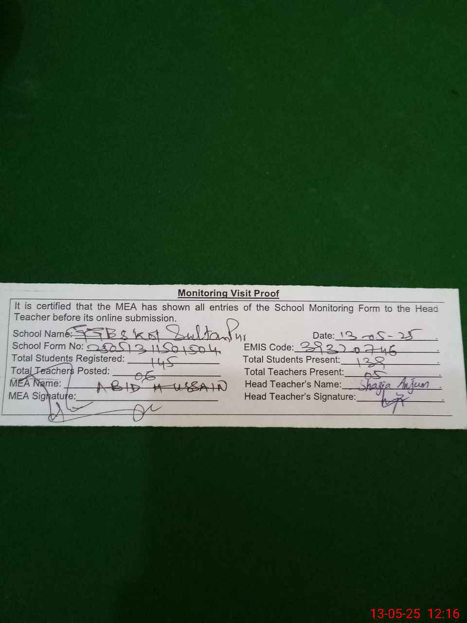 | Attendance Register | Head Teacher | MEA with School | Visit Proof |