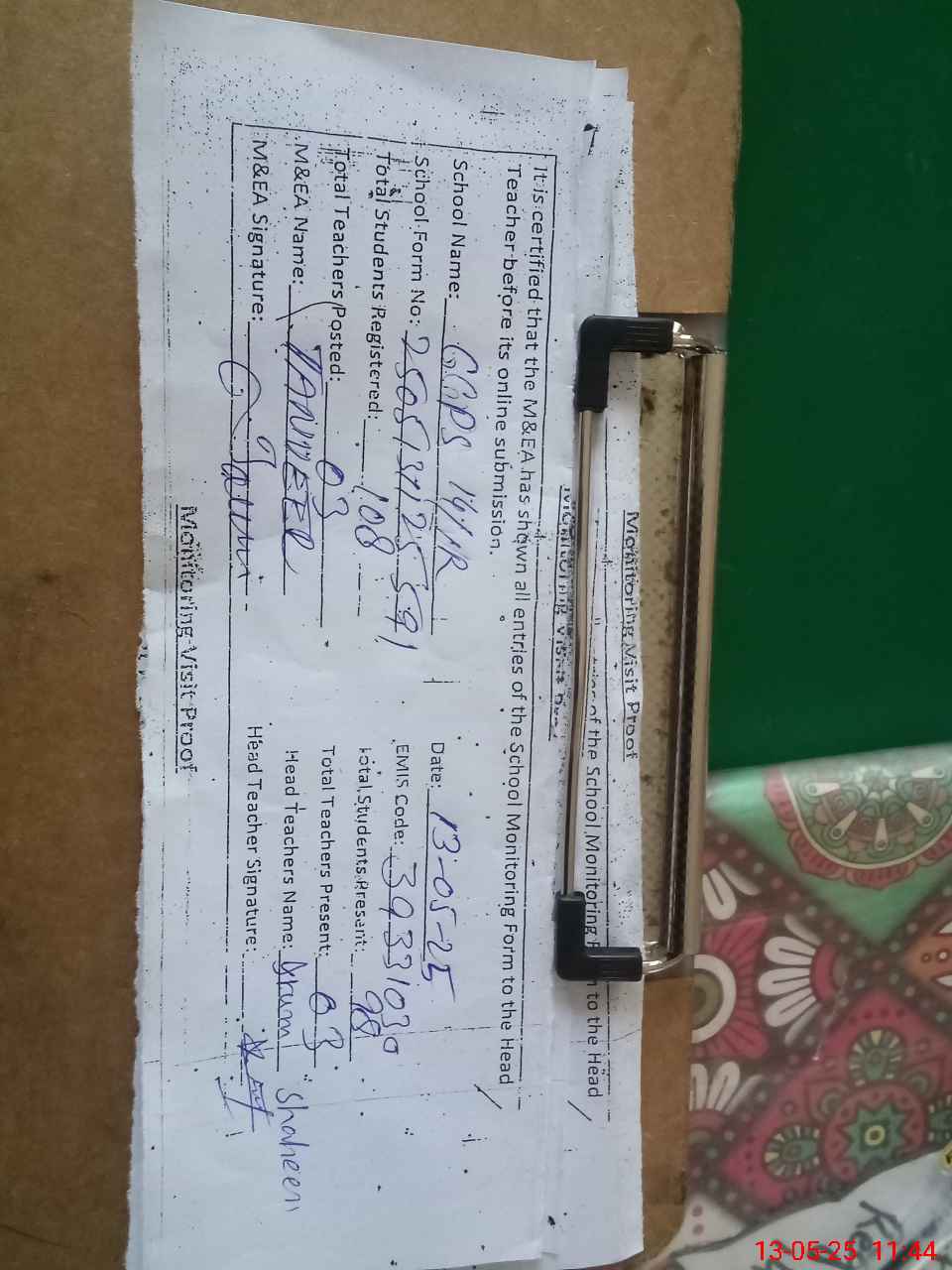 | Attendance Register | Head Teacher | MEA with School | Visit Proof |