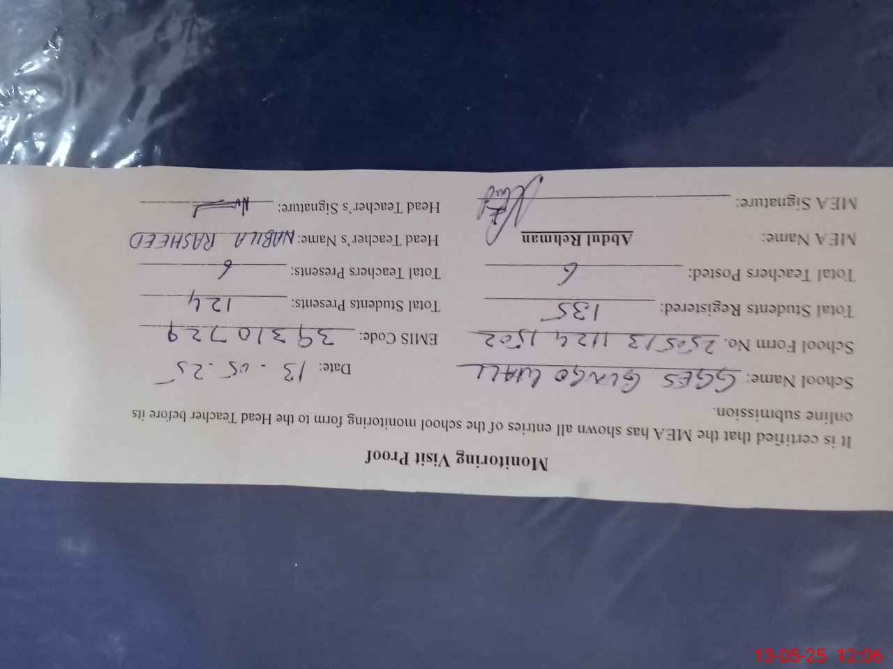 | Name: NA**** RA**** Designation: (School Headmaster's/Headmistress's) EST Phone/Cell Number: 03**** |
