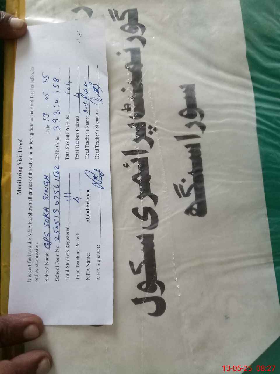 | Attendance Register | Head Teacher | MEA with School | Visit Proof |