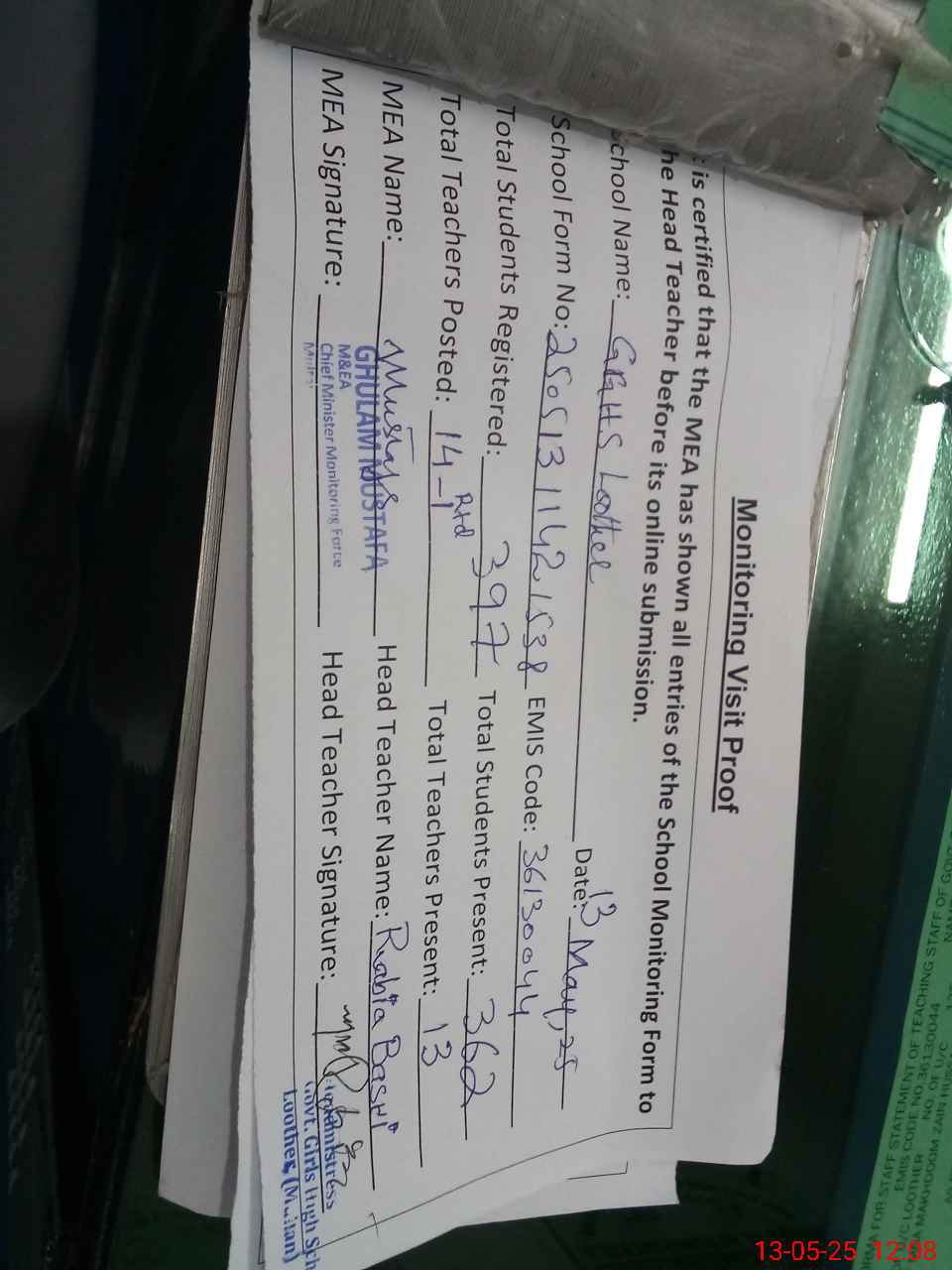 | Attendance Register | Head Teacher | MEA with School | Visit Proof |