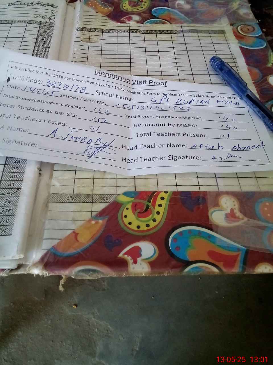 | Attendance Register | Head Teacher | MEA with School | Visit Proof |