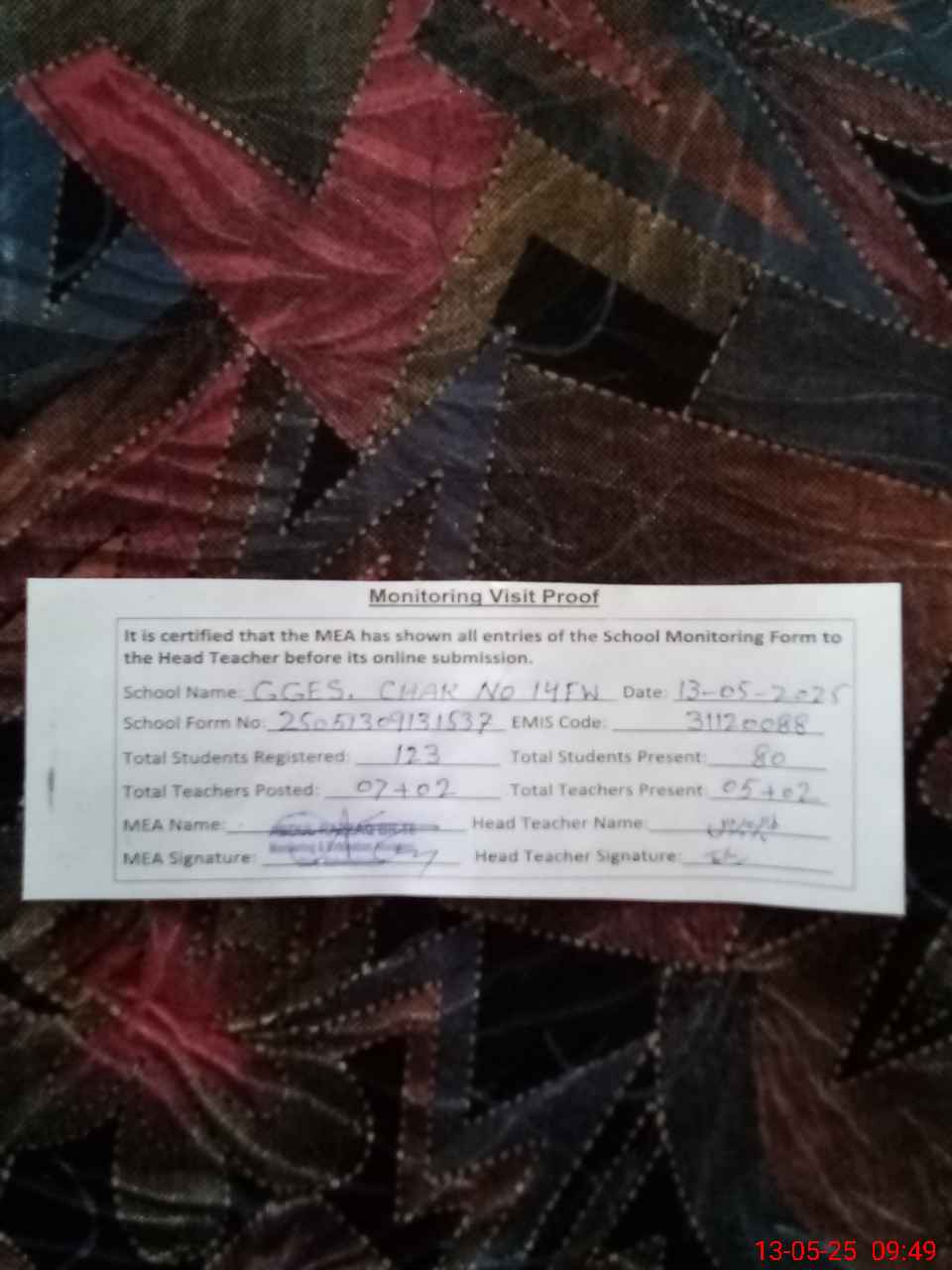 | EMIS Code: 31120088 | Name of School: GGES CHAK NO. 14 FW | |||