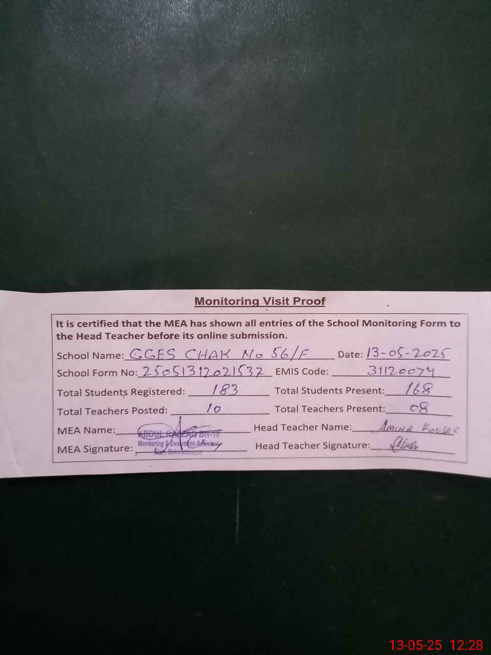 | Attendance Register | Head Teacher | MEA with School | Visit Proof |
