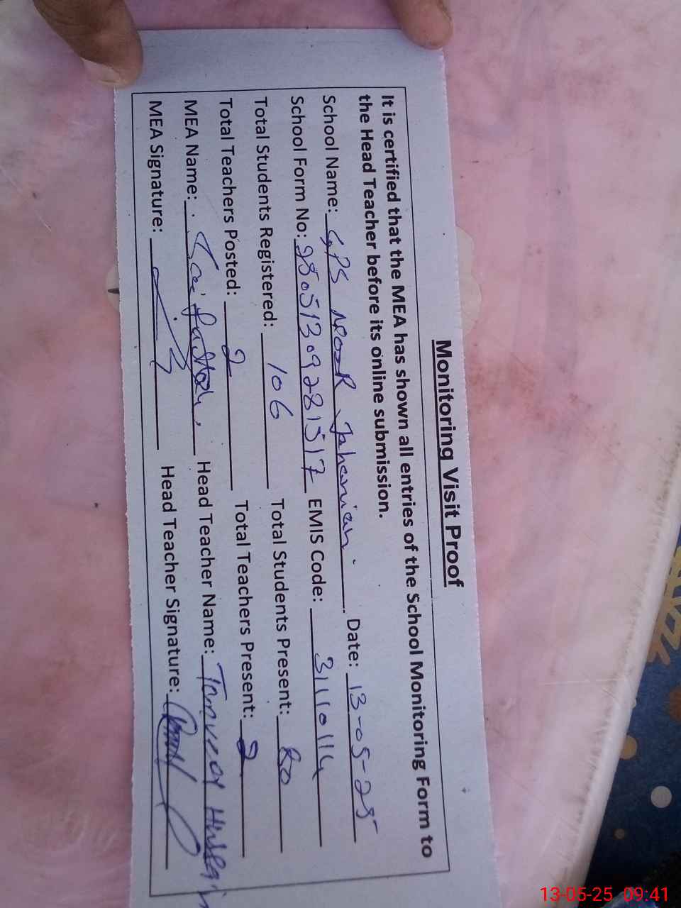 | EMIS Code: 31110114 | Name of School: GPS NOOR JAHANIAN | |||