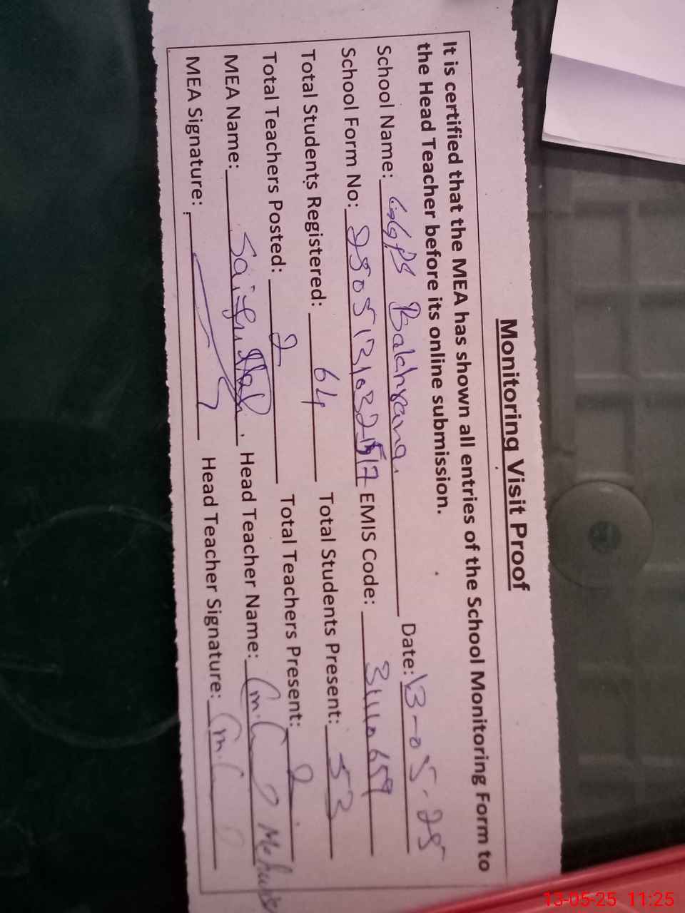 | Attendance Register | Head Teacher | MEA with School | Visit Proof |