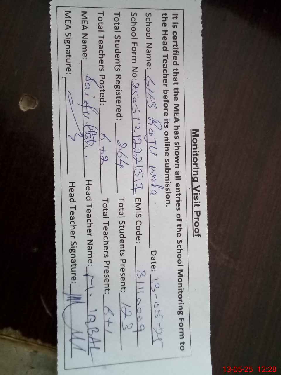 | Attendance Register | Head Teacher | MEA with School | Visit Proof |