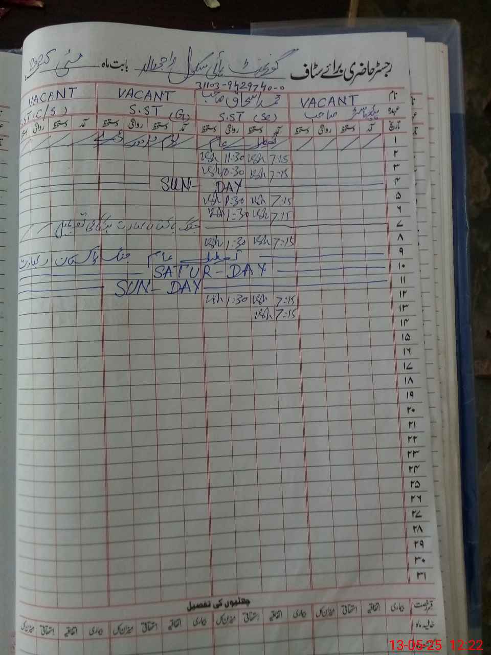 | CNIC | Full Name | Designation | R/C | Absence During Last Calender Month |