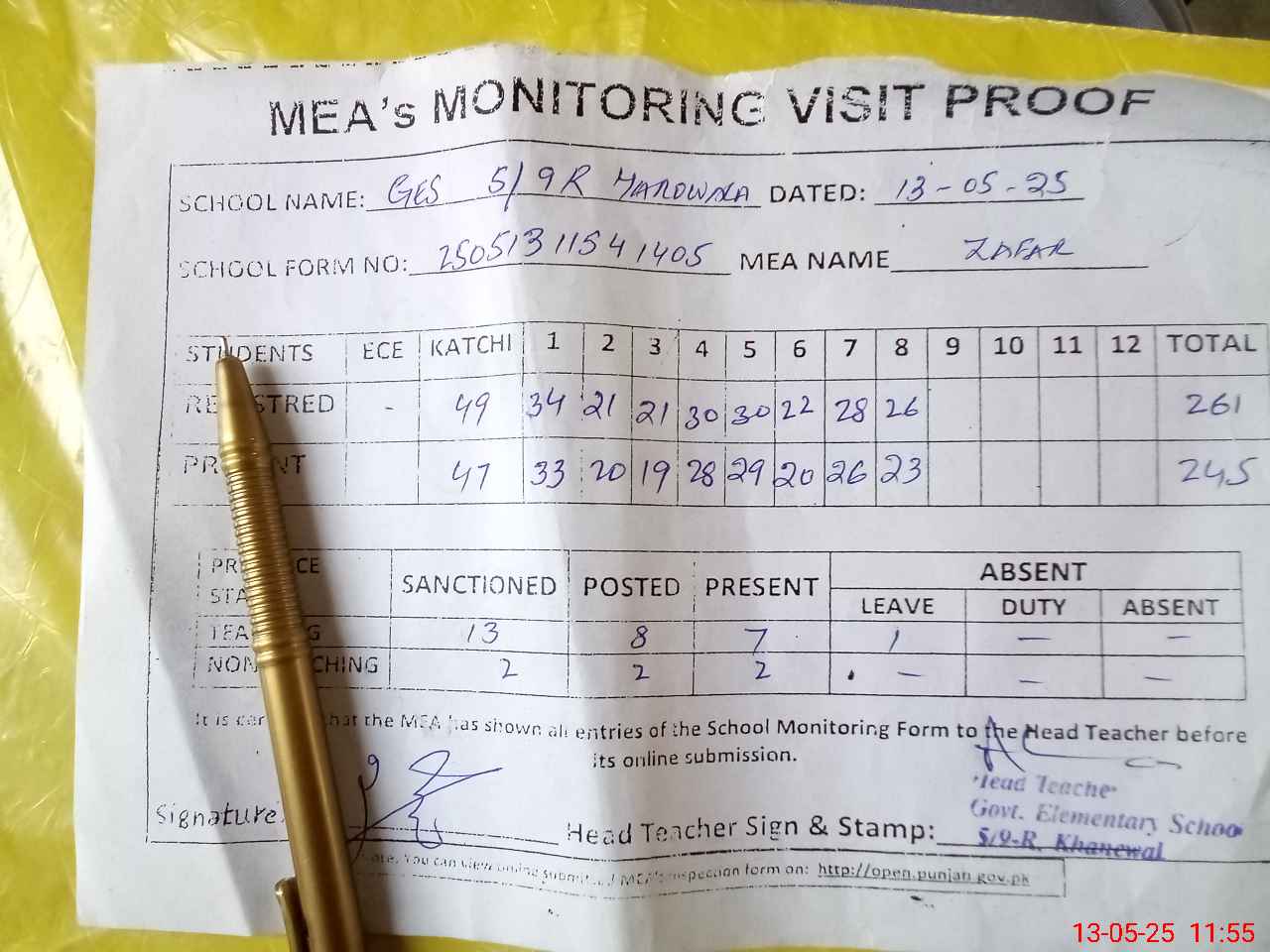 | Attendance Register | Head Teacher | MEA with School | Visit Proof |