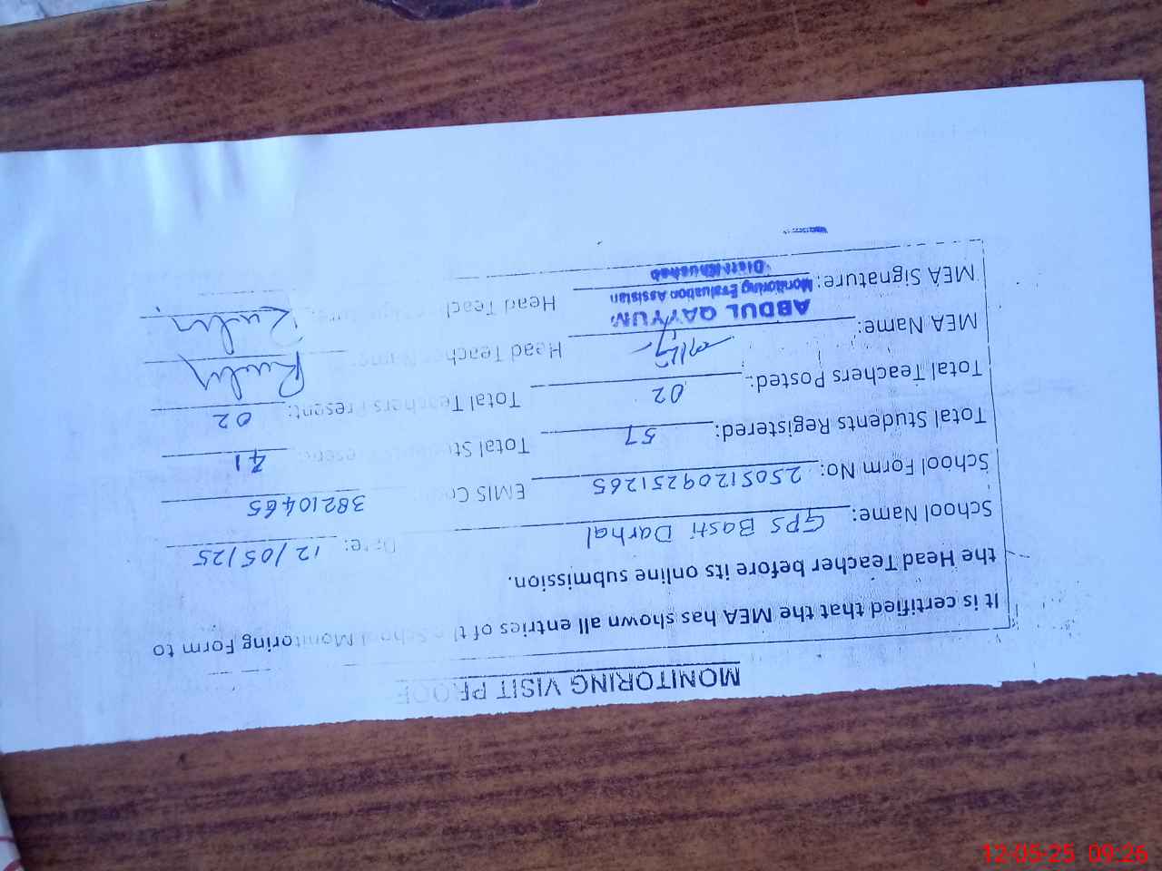 | Certified that this School was Inspected by the Undersigned MEA/DMO Today and the Information Stated Above is as Per Record. | |||||