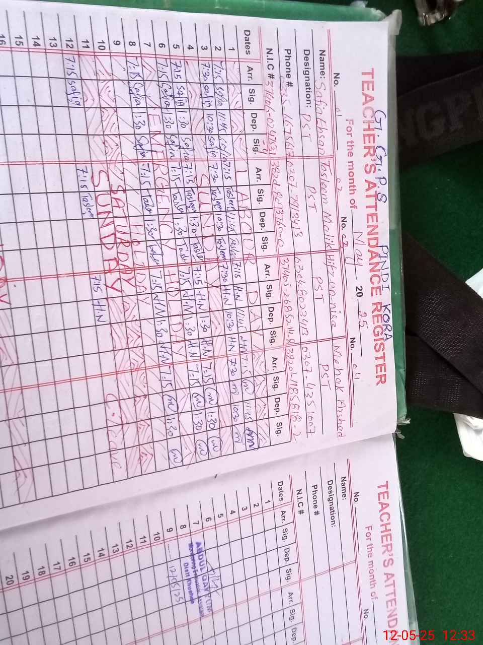 | CNIC | Full Name | Designation | R/C | Absence During Last Calender Month |