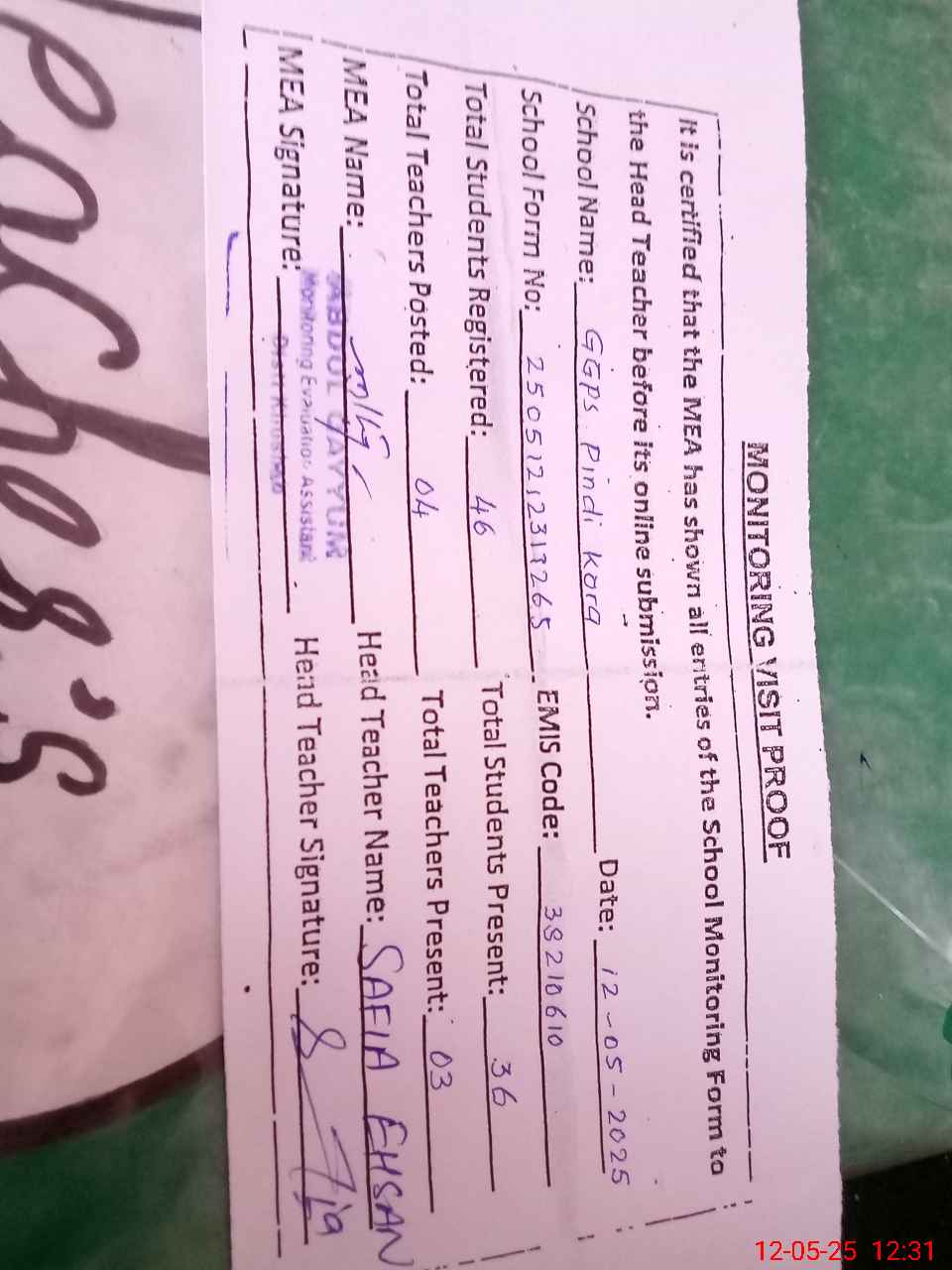 | Attendance Register | Head Teacher | MEA with School | Visit Proof |