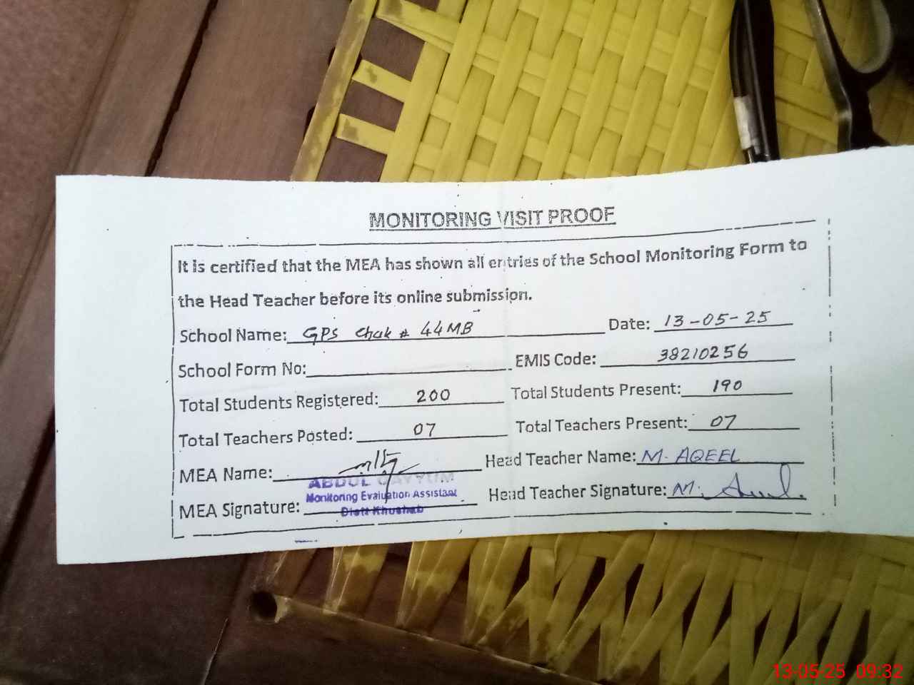 | EMIS Code: 38210256 | Name of School: GPS CHAK NO 44 MB | |||