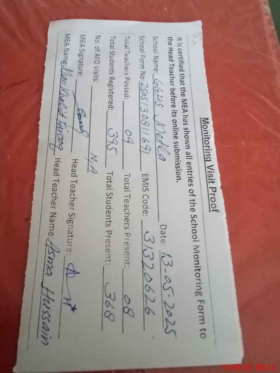 | Attendance Register | Head Teacher | MEA with School | Visit Proof |