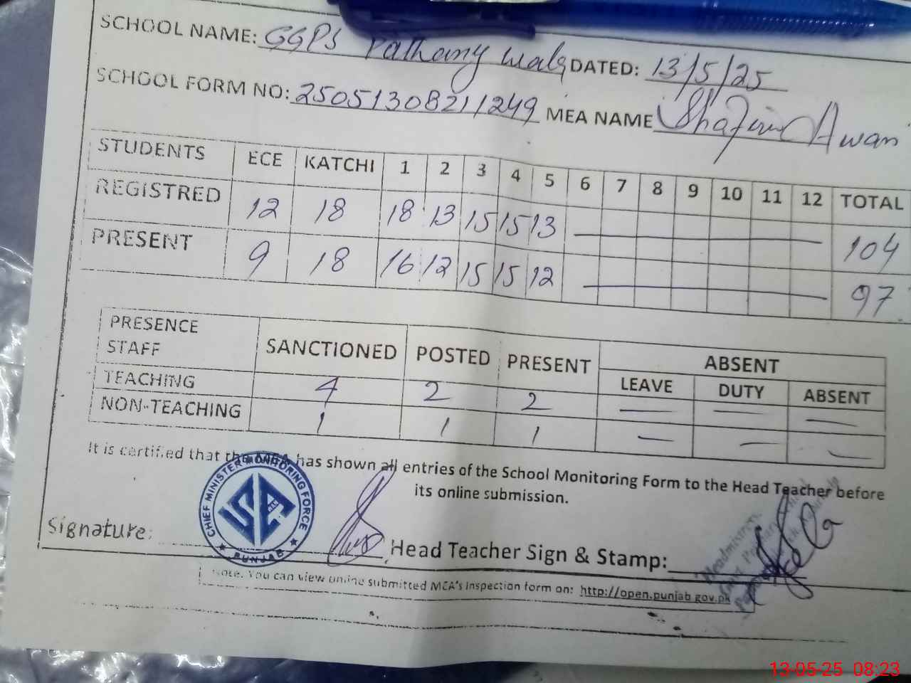 | Attendance Register | Head Teacher | MEA with School | Visit Proof |